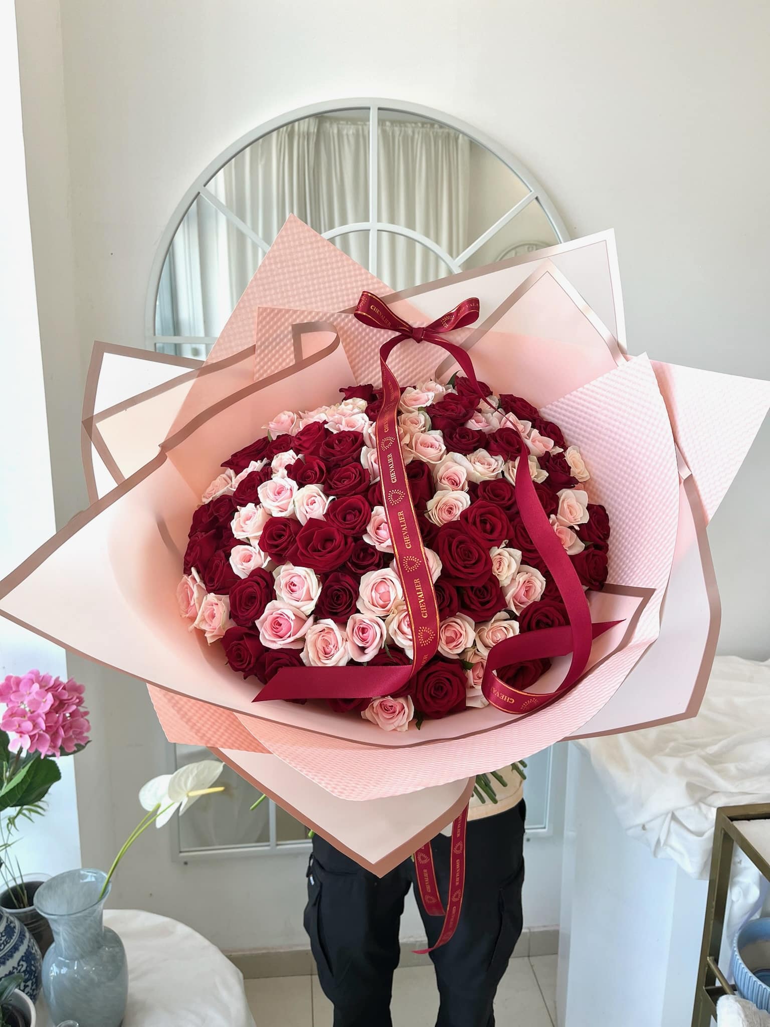 קונוס לבן פנינה יוקרתי עם סידור של ורדים ורודים עדינים, בכמות לפי בחירת הלקוח. *בתמונה המוצגת הקונוס מכיל 21 ורדים.