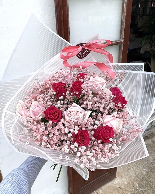 ₪410.00זר בוקט עם 15 ורדים ורודים (ורוד בייבי או ורוד פוקסיה בהתאם למלאי החנות) וגיבסנית ורודה. מגיע עטוף בנייר איכותי עמיד במים, ובסרט עדין ומלא בסטייל. העטיפה, הסט וגוון הורד משתנים בהתאם למלאי החנות.
