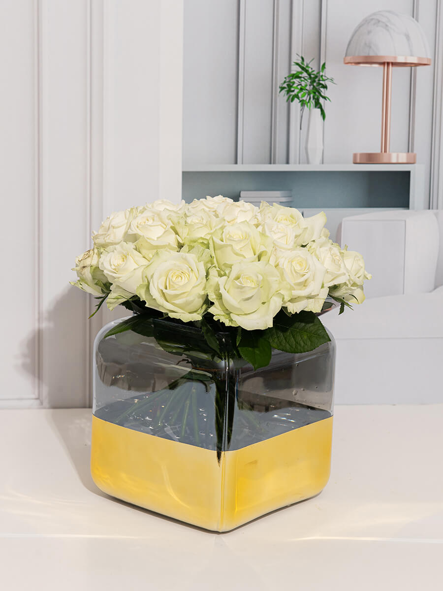 אגרטל זכוכית מעוטר זהב, שופע ורדים לבנים מרהיבים.