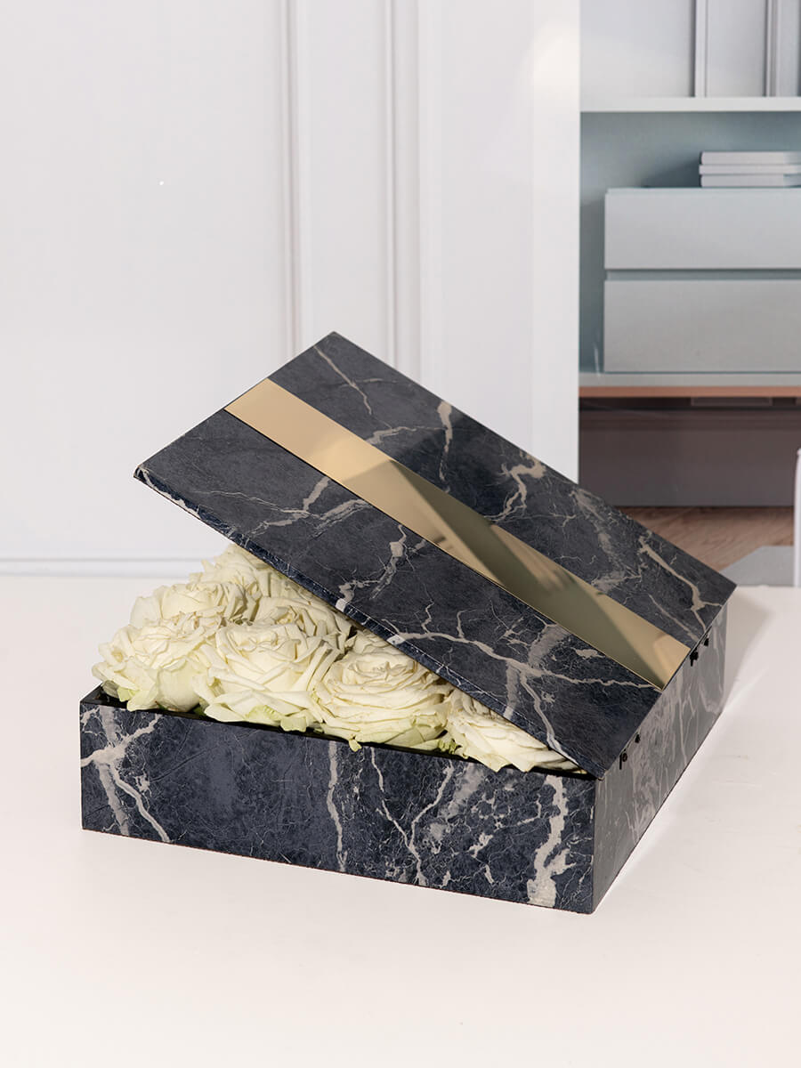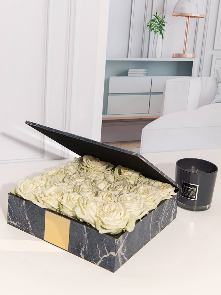 קופסת תכשיטים יוקרתית בצבע שיש כחול, המכילה כ- 35 ורדים לבנים מרהיבים.