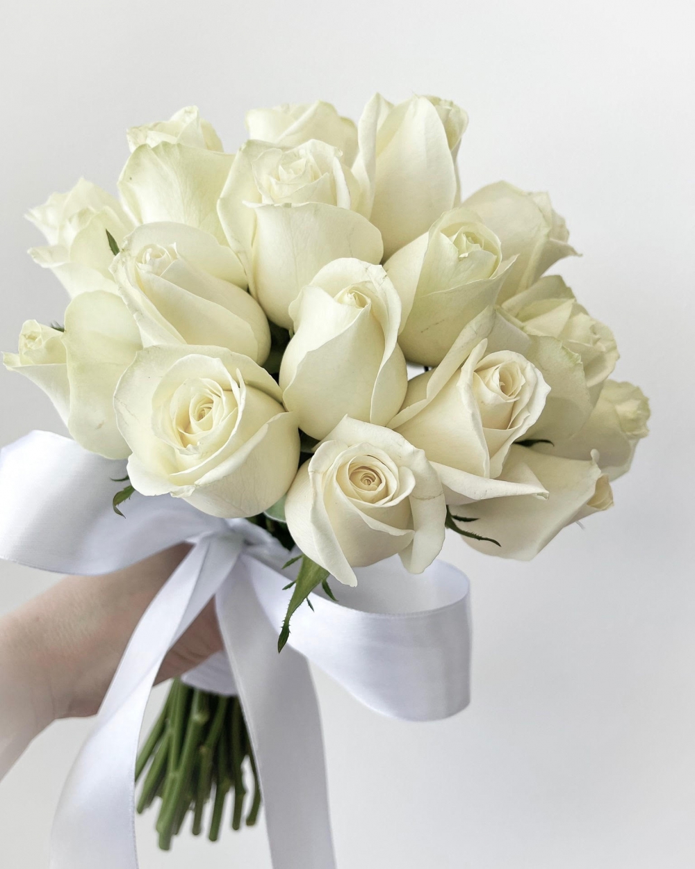 זר כלה קלאסי עם כ- 31 ורדים לבנים/קרם טריים שאינם פתוחים בשזירה עגולה ומדורגת.