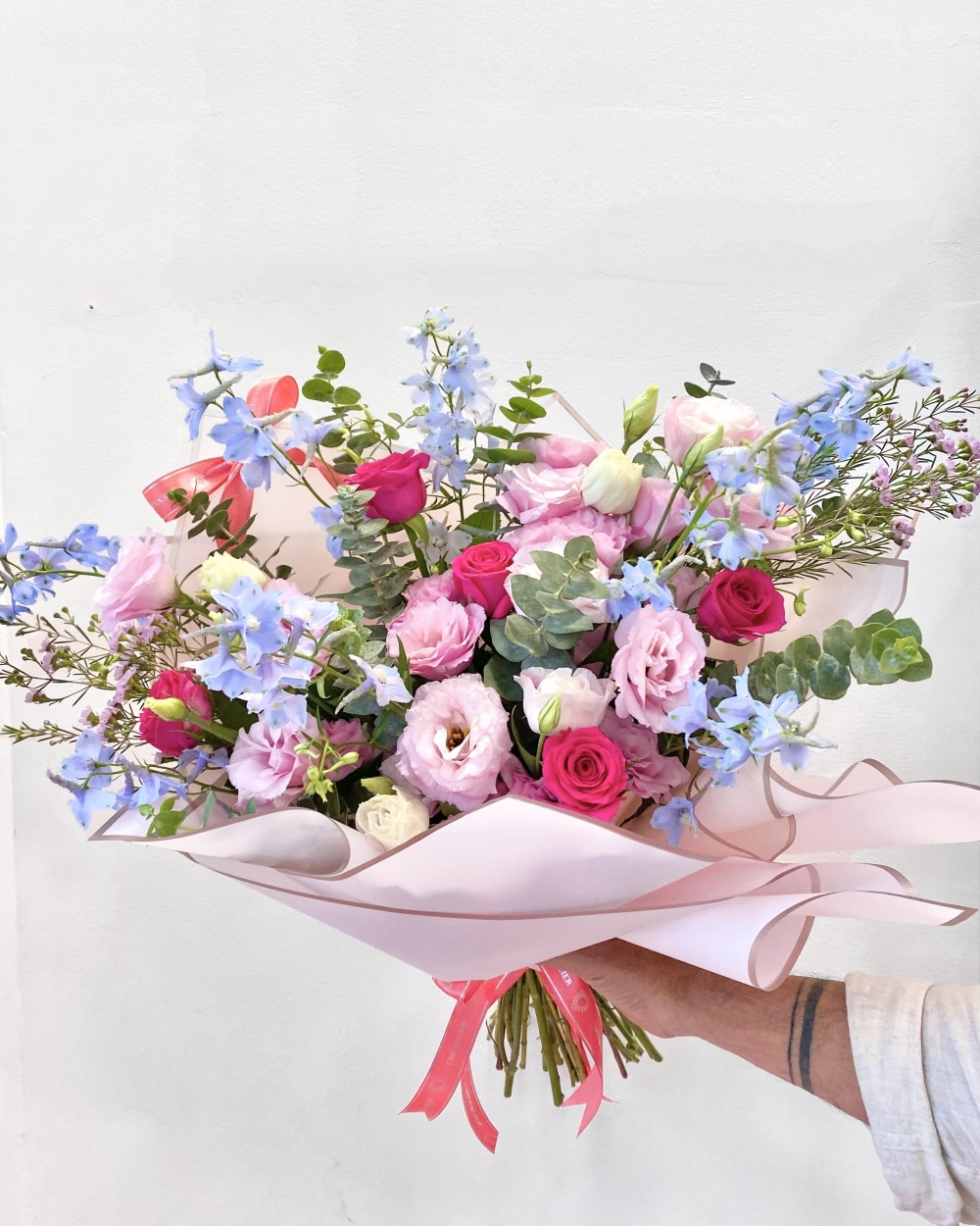זר קסום בגווני ורוד ותכלת עטוף באריזה איכותית מלאה סטייל ועמידה במים.