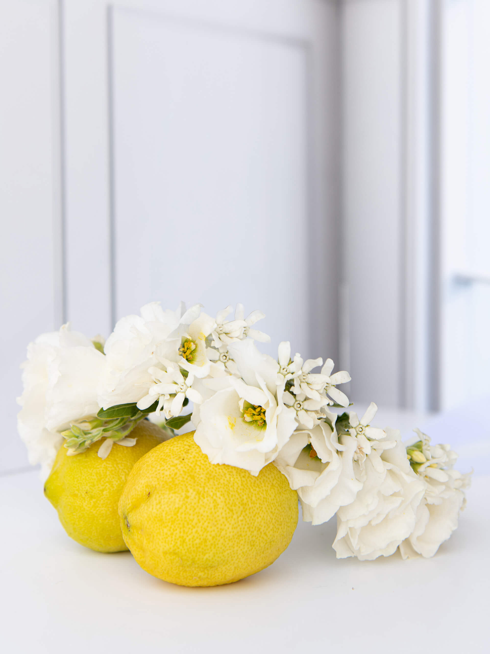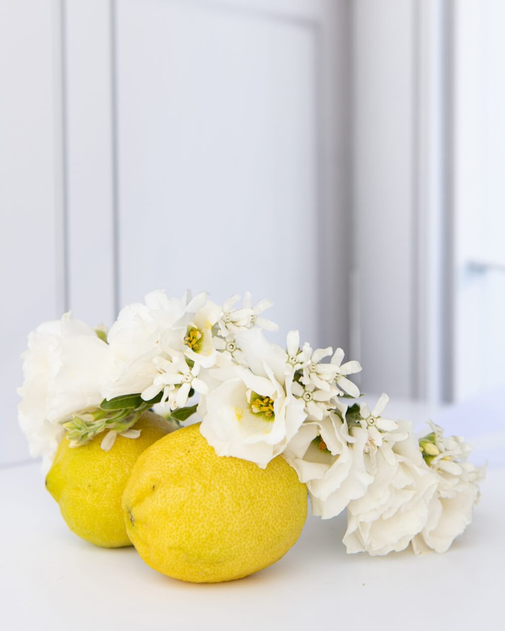 סידור ראש עדין ואלגנטי, שזור בפרחי ווידה וליזיאנטוס לבנים.