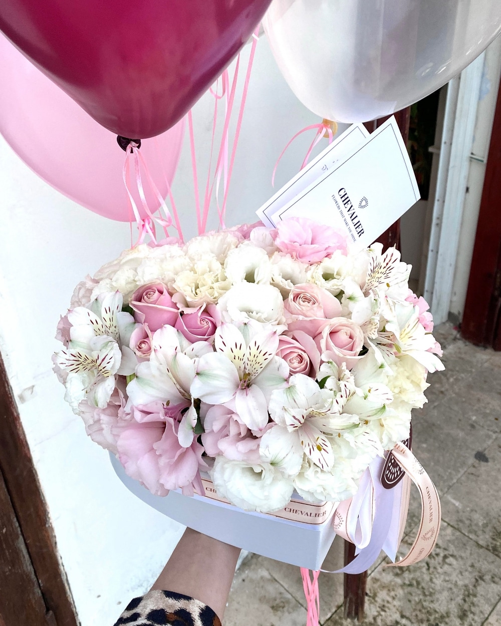 סידור פרחים מיוחד וקסום, המגיע בקופסת לב לבנה, מכיל ורדים, ליזיאנטוסים ואלסטרומריה.