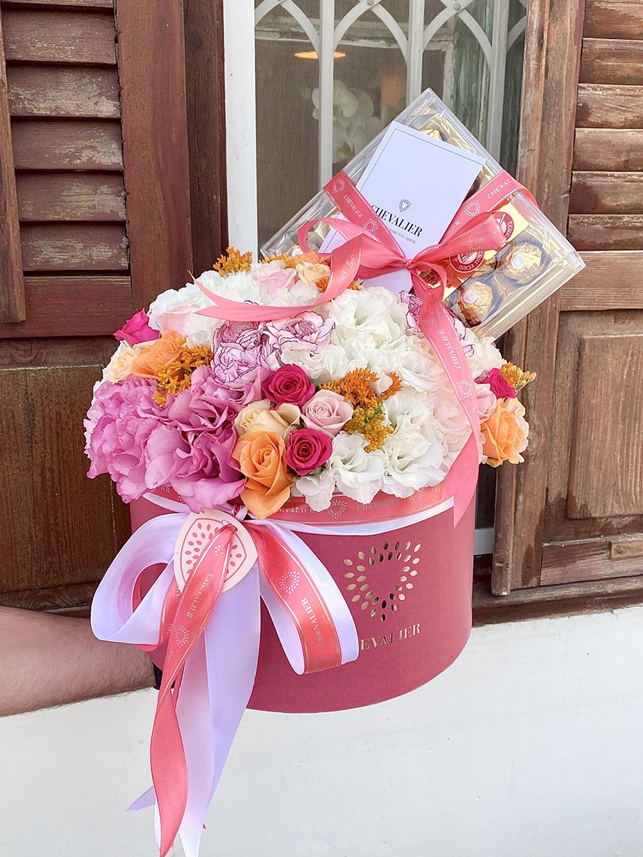 קופסת פרחים ענקית ומרשימה, המשלבת מגוון רחב של פרחים בגווני ורוד כתום ולבן, השזורים זה ובזה ויוצרים הרמוניה מוחלטת.