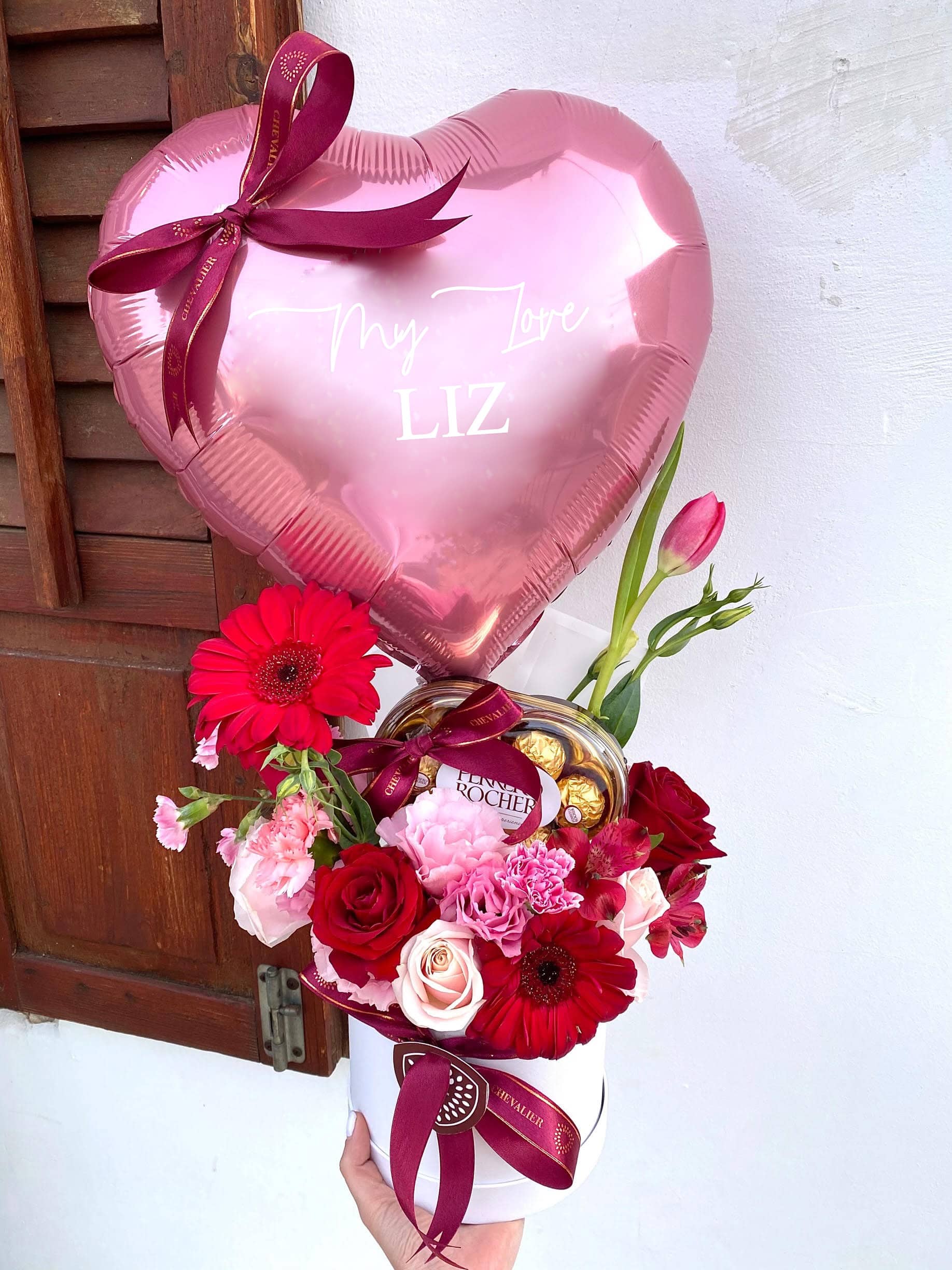 שבמארז אחד יש פשוט הכל כדי לעשות אותה מאושרת!! מארז יוקרתי בקופסא עגולה המכיל סידור פרחים עשיר ומגוון בגווני אדום וורוד, מכיל מארז לב פררו רושה ובלון מיילר לב ורוד עם הקדשה מיוחדת… המארז מגיע ב- 3 גדלים.