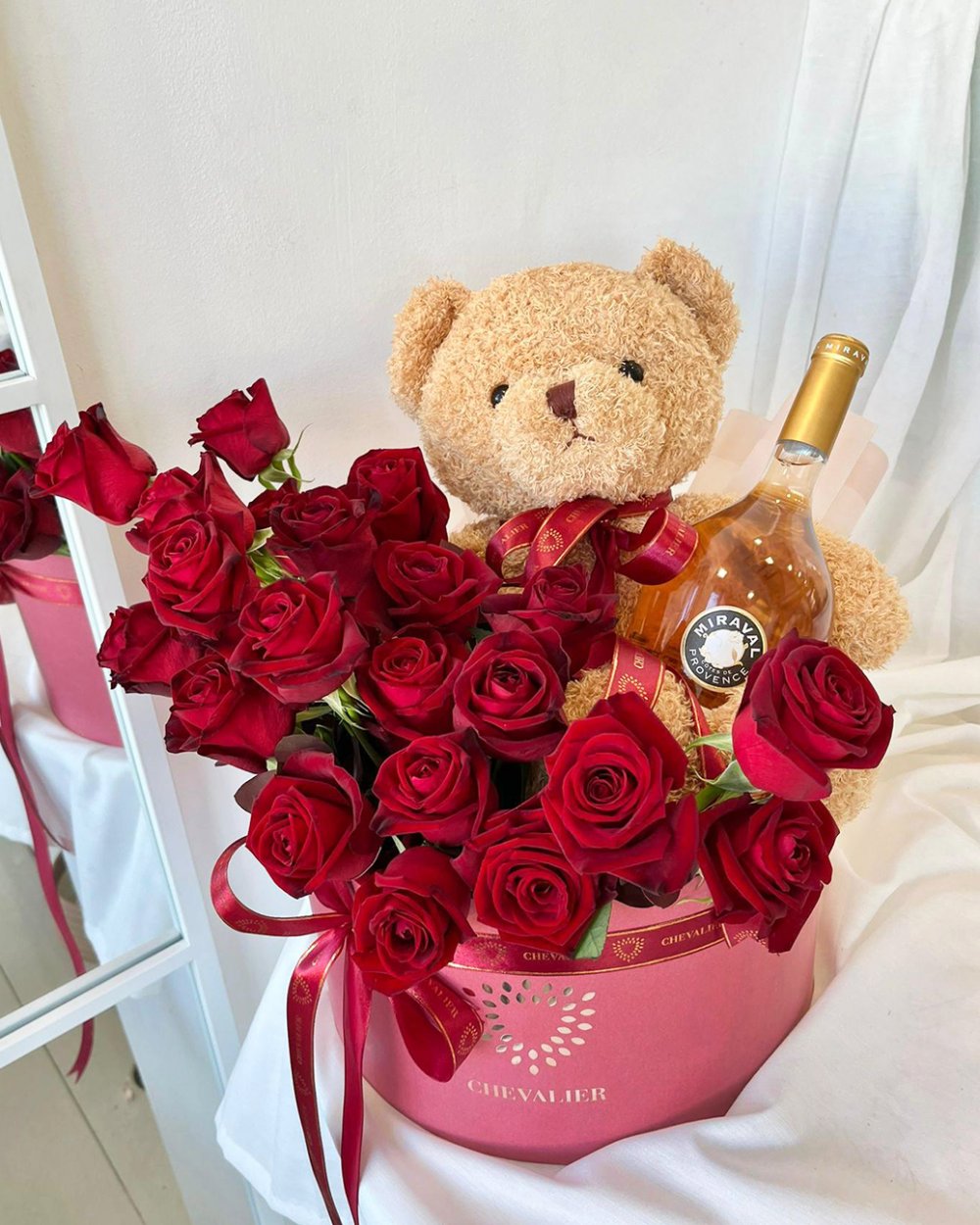 המארז המושלם להראות את האהבה שלכם, מארז עם 25 ורדים אדומים ודובי מפנק בקופסא רומנטית ענקית.