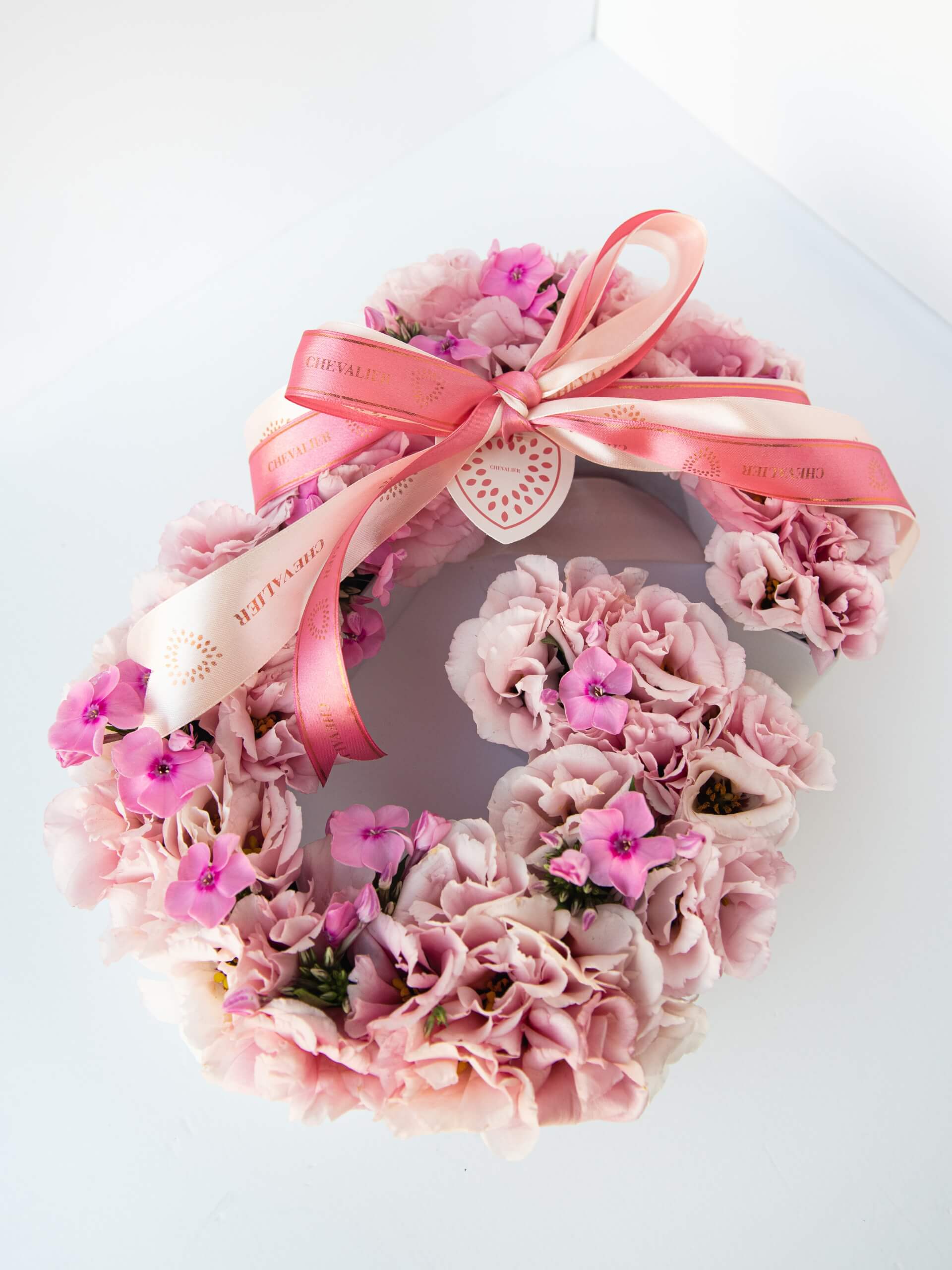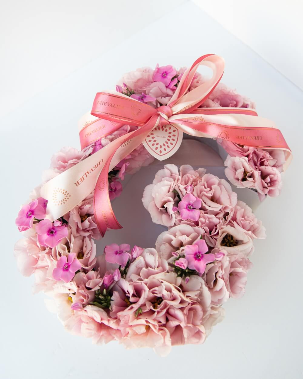 סידור אות מלאה בפרחי ליזיאנטוס ורודים עם ניצוצות של פלוקס ורוד.