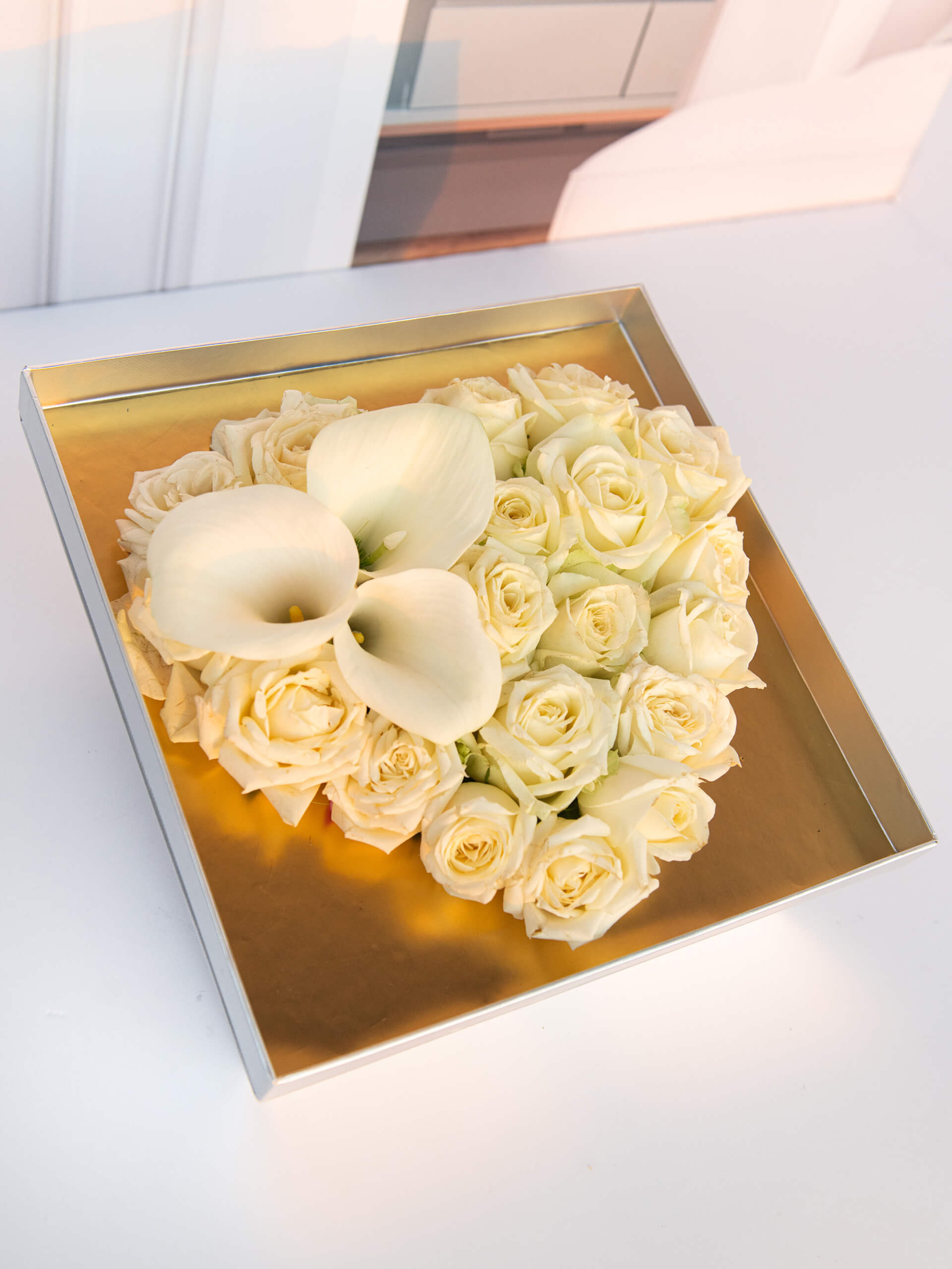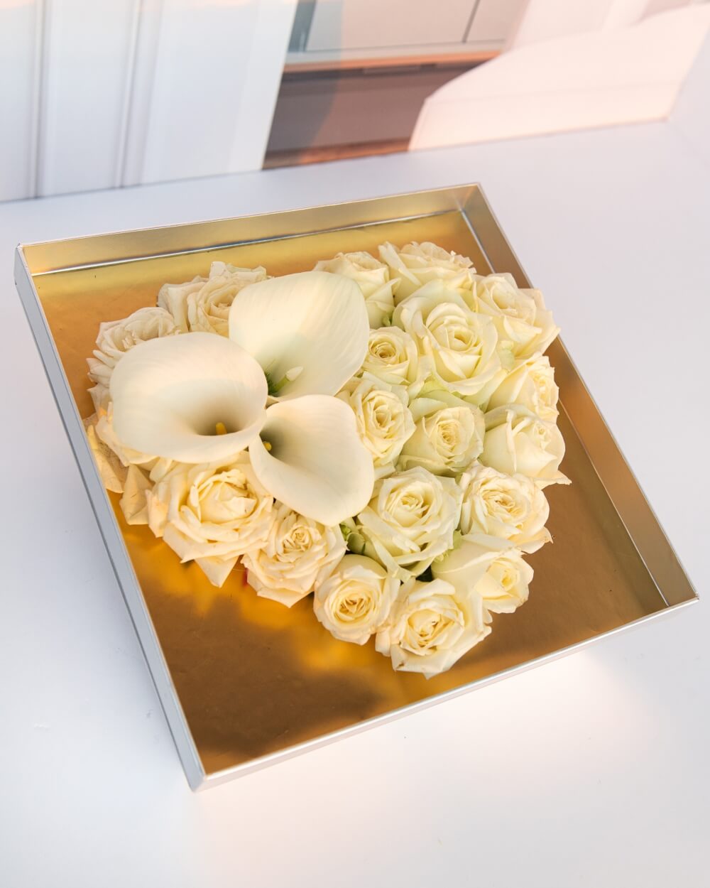 סידור פרחים בצורת לב המגיע בקופסא איכותיות ועבה בצבע כסף, הסידור מכיל ורדי אוולנש בצבע קרם ו- 3 קאלות לבנות היוצרות פרח משגע.