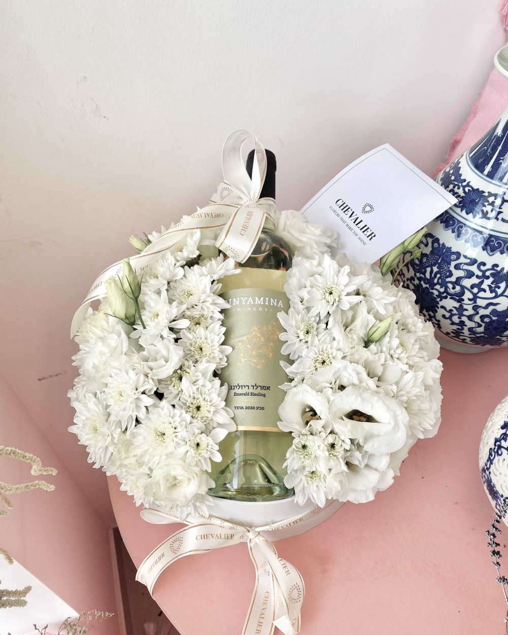 סידור עגול קסום בצבעי לבן המכיל פרחי העונה, הסידור מגיע עם יין לבן וסרטים מלאים בסטייל.