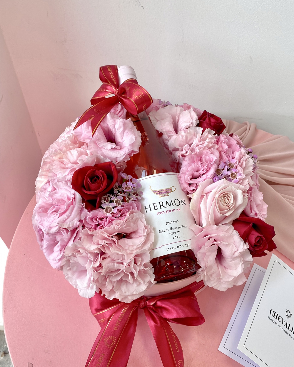 סידור פרחים בקופסא עגולה בצבעי ורוד ואדום. הסידור מגיע עם יין רוזה וסרטים מלאים בסטייל.
