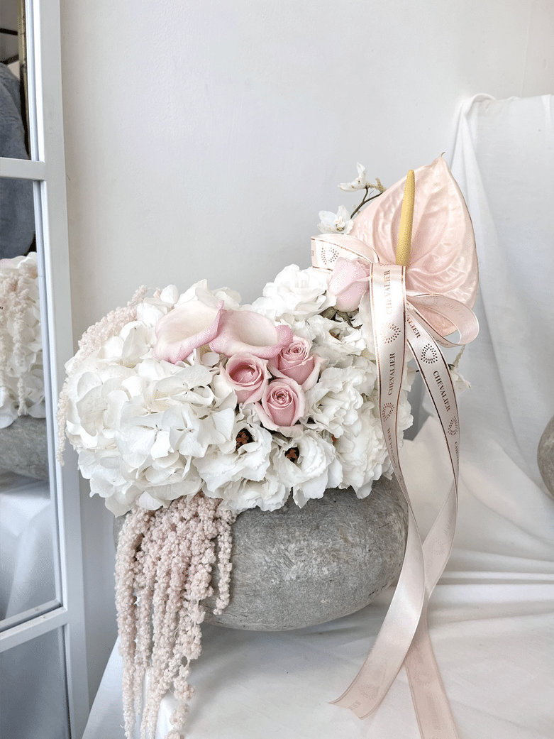 סידור אה-סימיטרי, יוקרתי, אמנותי ומרהיב ביופיו, מכיל פרחים איכותיים בצבעי לבן וורוד עדין הסידור מגיע בכלי חרסינה צמיגי עם פיגמנט אבן, משולב סרט איכותי.