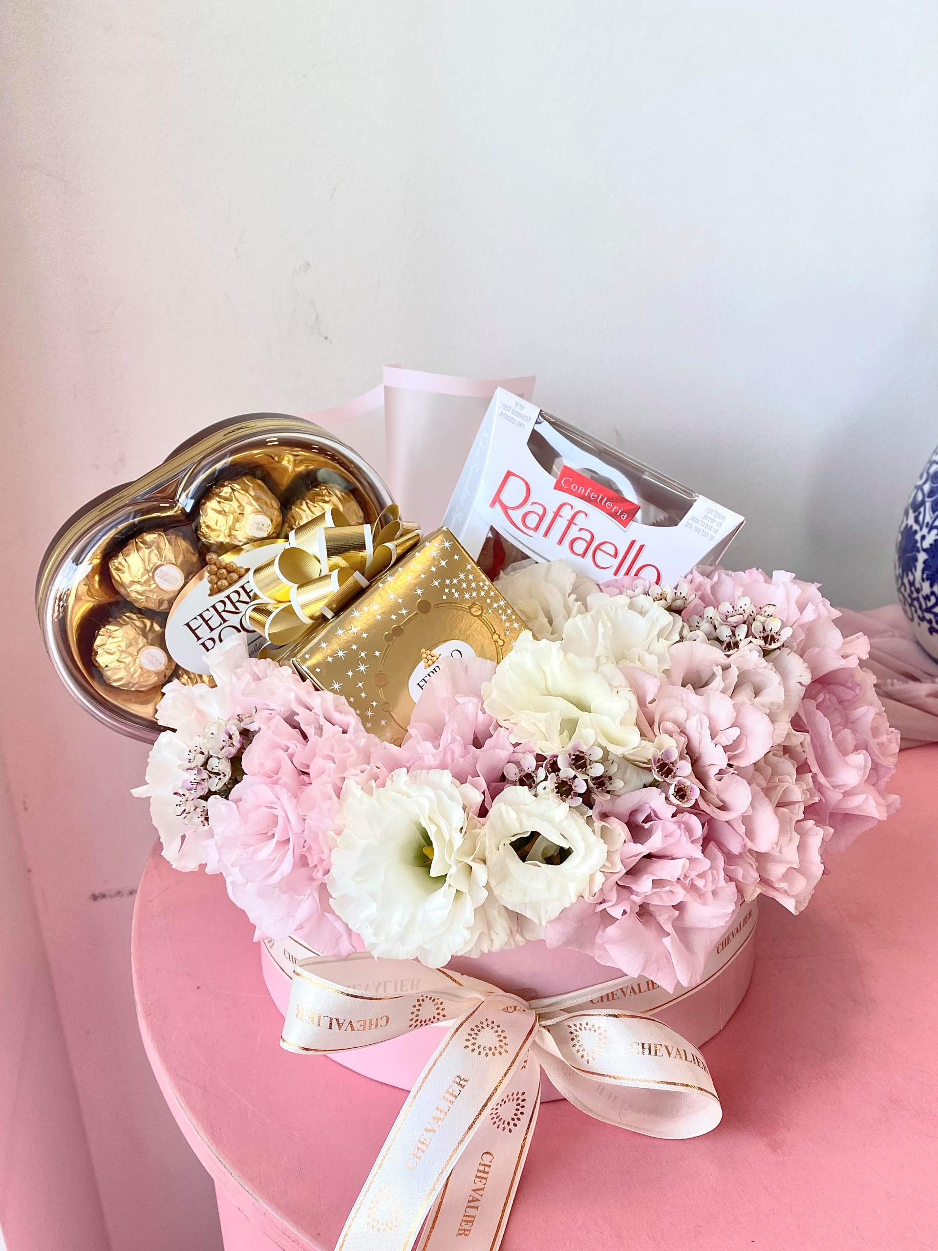 סידור עגול קסום בצבעי לבן, ורוד, הסידור מגיע עם 3 סוגי שוקולדים (בהתאם למלאי החנות, בכשרות “כשר חלב נוכרי”).